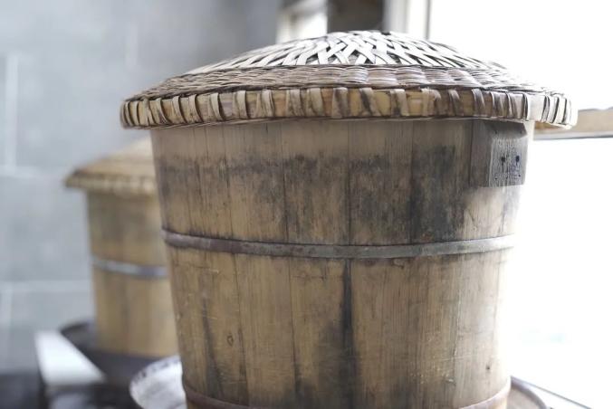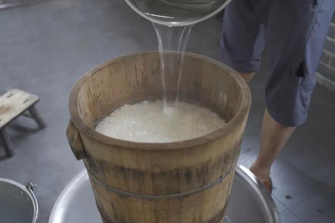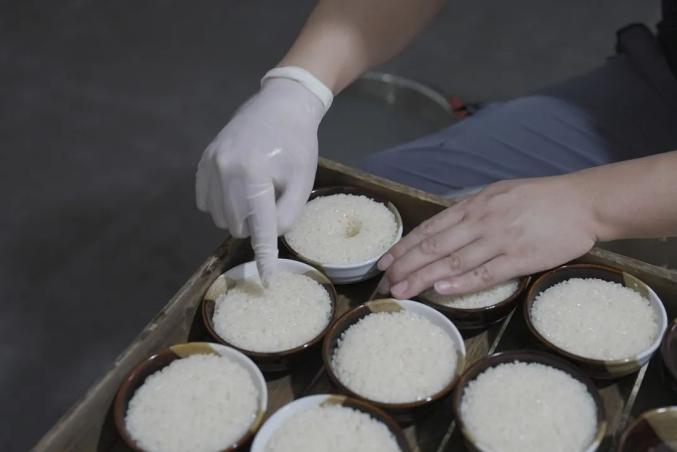 将优质糯米用小木桶蒸熟后,再用凉水冷却,撒上祖传秘制酒曲,装钵,点酒眼,发酵,每一步赵海成都做得很专注,这些步骤他已十分熟练。