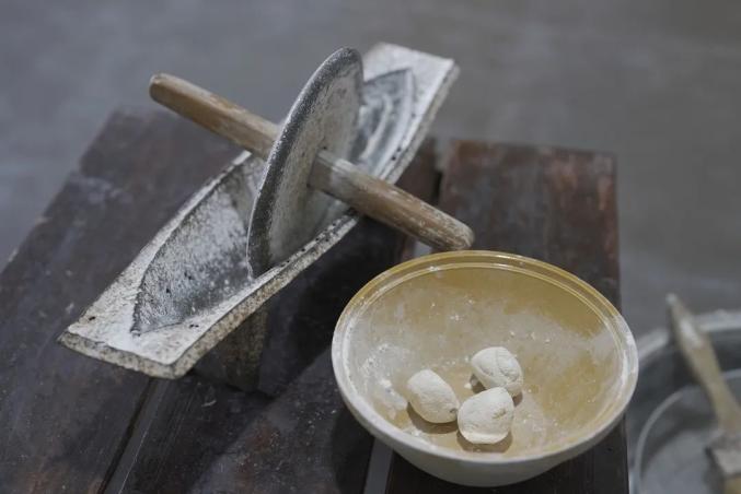 “酒曲的制作质量是对于甜酒的美味十分重要,这是我家的祖传秘方”,赵海成告诉小编,郭福娭毑小钵子甜酒的酒曲制作十分讲究,是在中秋前后,气温在30度左右的晴朗天气,将本地的辣廖草、荷花、兰草等一起舂碎和本地的早稻米粉子混合后搓成小丸子,再将陈年酒曲碾成粉末撒在其上,经过发酵后即成为蓬松的球状酒曲。每年可制作的时间,不超过2月。