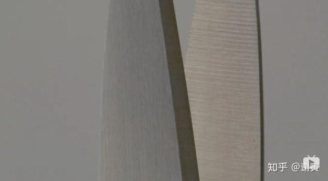 移动激光笔,激光照在剪刀不同的位置上,会在墙上形成不同的图像但是为什么会是这样呢? 仔细观察剪刀的表面 左侧是竖条纹,右侧是横条纹。是因为这个吗?观察刚才的直尺,上面也有细小的横条纹