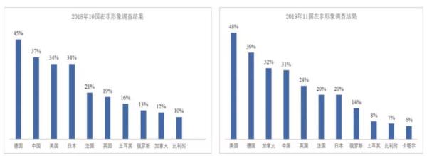 法国在非形象调查结果2018-2019|数据来源:2018年数据源自“L’Image de la France Dégradée au Yeux des Leaders d’Opinion en Afrique”