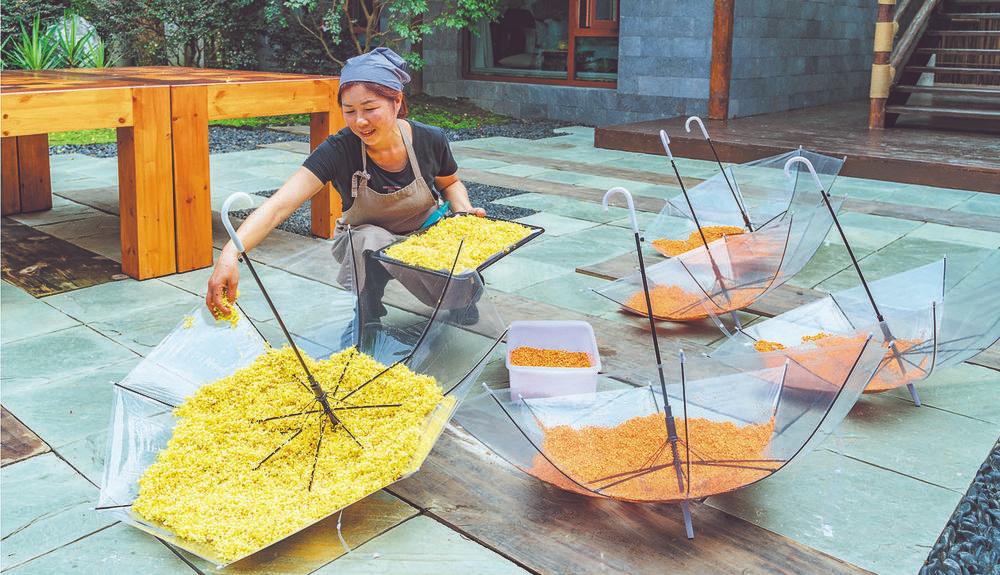 村民正在晾晒收集来的桂花