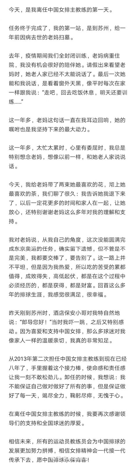 9月1日,郎平通过个人社交平台正式宣布卸任中国女排主教练,并祝愿中国排球永葆青春。全文如下: