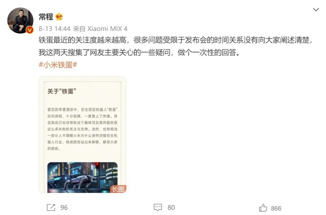 ▲小米集团副总裁常程在微博上谈论铁蛋