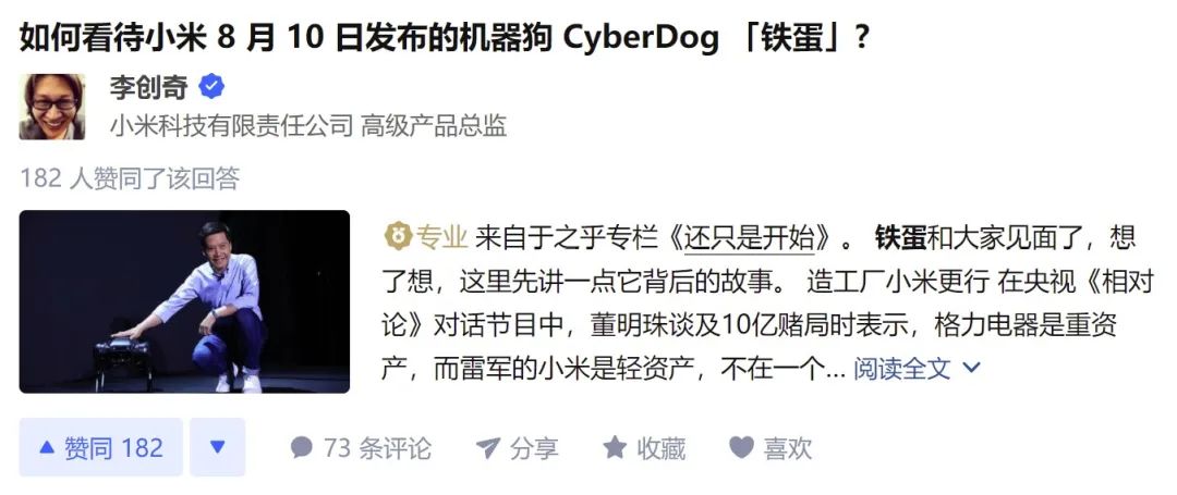小米集团副总裁常程在微博上回答了这个疑问。常程认为,仿生机器人未来在服务、工程、安防、医疗等领域都蕴含着巨大的市场潜力,另一方面也能帮助小米进行技术布局,夯实专利储备。此外,仿生机器人的探索过程也是在做技术预研,其中的机器视觉、导航避障、人机交互、AI语音算法等技术可以反哺手机、智能家居等产品。