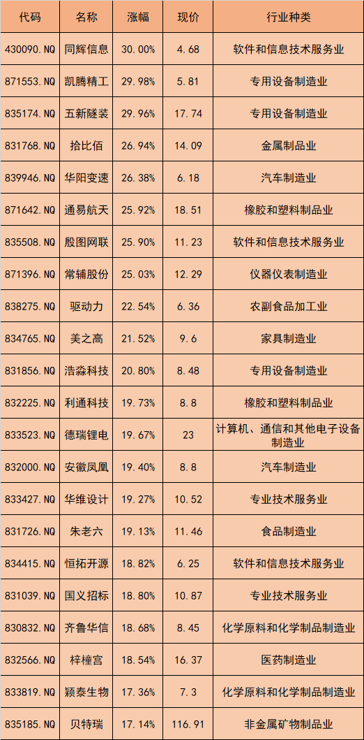 9月6日,有42只精选层股票当日上涨超过10%,11只股票上涨超过20%。同辉信息涨幅达到30%,凯腾精工、五新隧装、拾比佰等7家公司股价上涨超过25%。