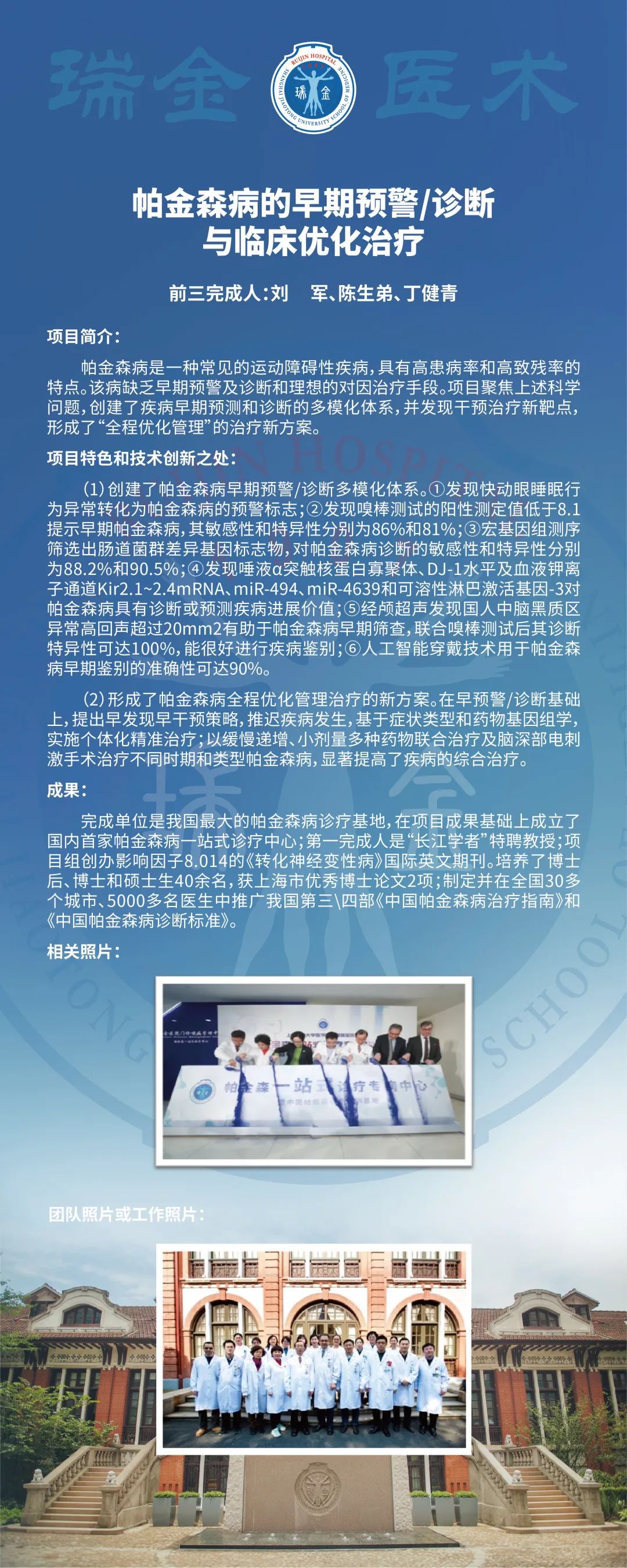 瑞金医院神经内科聚焦帕金森病“缺乏早期预警及诊断和理想对因治疗手段”等问题,创建了疾病早期预测和诊断的多模化体系,并发现了干预治疗新靶点,形成了帕金森病“全程优化管理”治疗新方案。