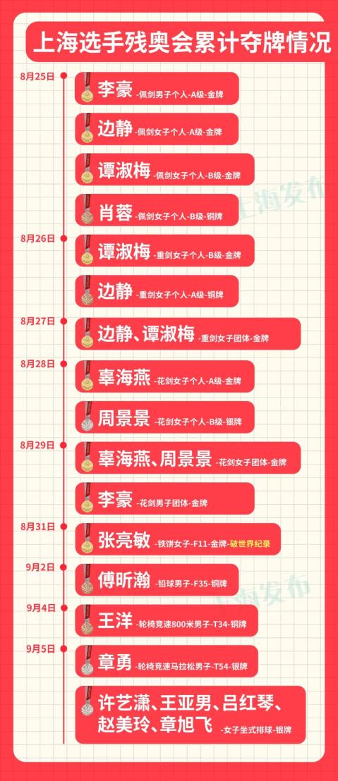 市残联说,本届残奥会上海共有22名运动员、4名教练员等入选东京残奥会中国体育代表团,按照参赛项目,共取得9金3银4铜、破1项世界纪录的优异成绩,为中国体育代表团作出了重要贡献。
