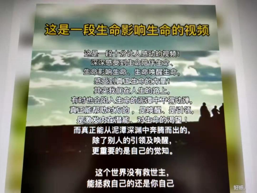 心情久久不能平静之余,更加感念此片带给人类的诸多启示。正如片尾字幕中所启迪的那样:“这是一段十分让人感动的视频!深深感受到生命陪伴生命、生命影响生命、生命唤醒生命、感受到真正生命的力量。其实我们在人生的路上,有时也会陷入生命的泥潭中不得动弹,真正能帮助对方的,是唤醒、是引领,是激发内在潜能、对生命的渴望!”