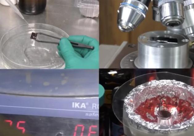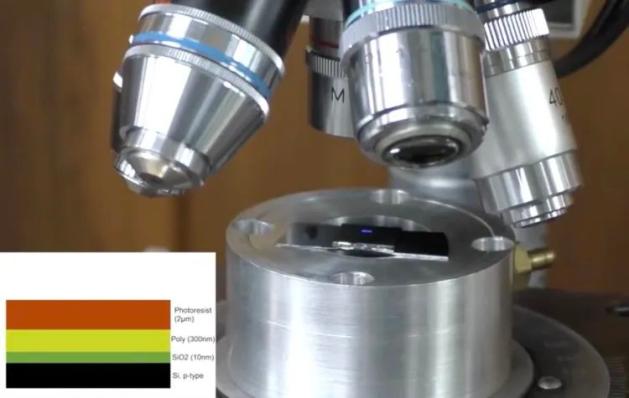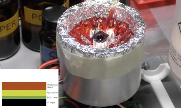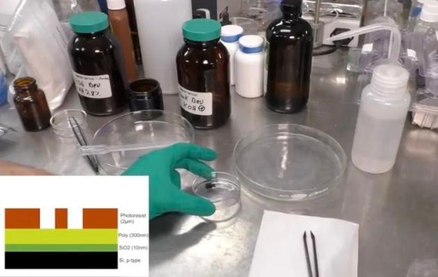 Zeloof首先要做芯片的掺杂层,它能形成mosfet的源极和漏极,他把切好的晶圆放到自旋机上,然后在上面沉积光刻胶,只需要大概100微升光刻胶就能覆盖整个晶圆,然后以4000rpm的速度旋转30秒将多余的光刻胶旋出。