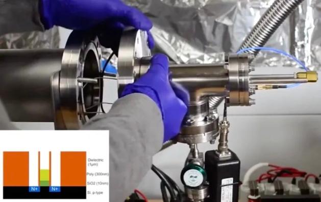 随后对芯片进行清洁干燥,然后加上磷溶液并进行旋转,接着在一千多摄氏度的高温下烘烤45分钟,这样才能将磷原子转移到刚才用光刻胶形成的小井中,以形成mosfet的源极和漏极。