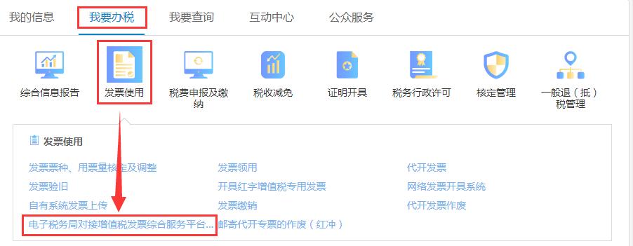 2. 点击【我要办税】→【发票使用】→【电子税务局对接增值税发票综合服务平台相关应用功能】。