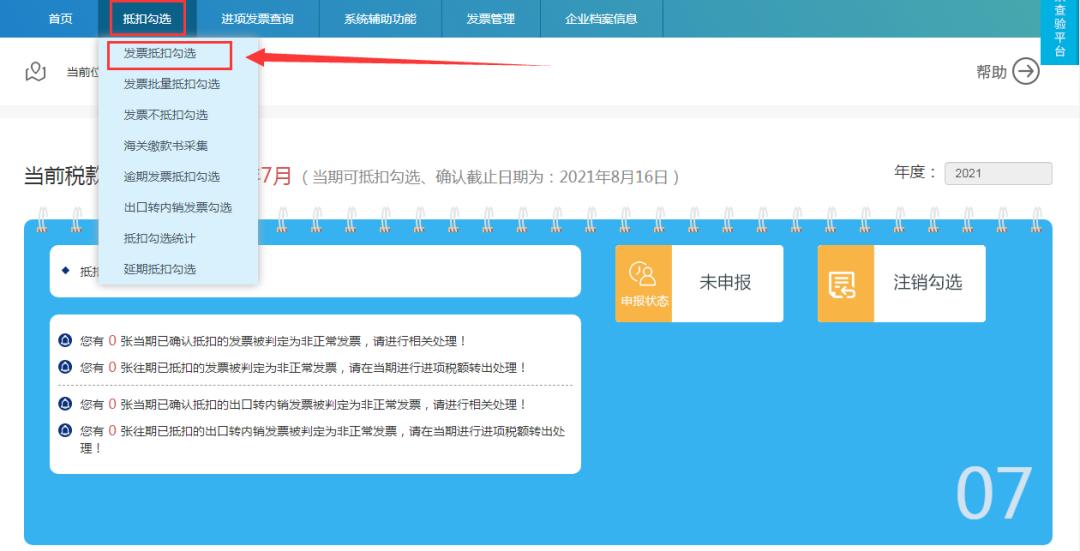 3. 点击【抵扣勾选】→【发票抵扣勾选】。