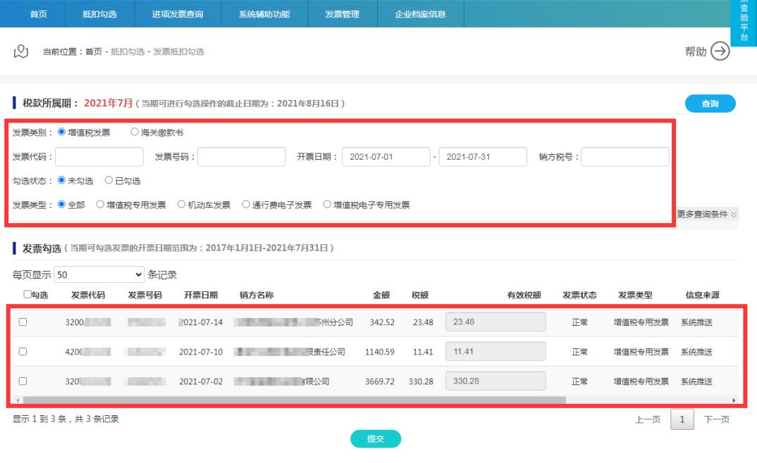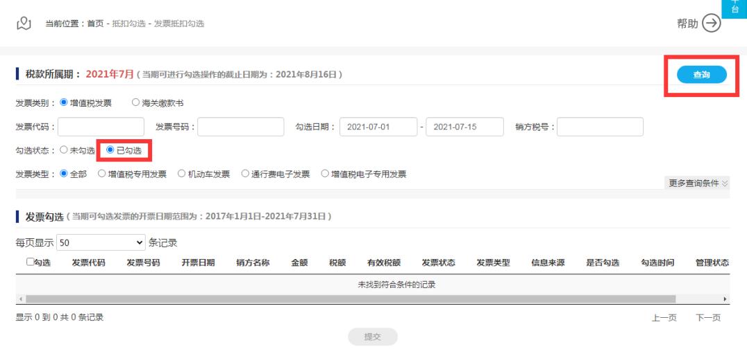 4. 如下图,选择查询条件,查询出未勾选发票,在需要勾选的发票信息前打“√”,点击【提交】。注意开票日期的选择,如果发票不多直接按开票日期查询,如果发票较多,可以输入发票号码精准查询。
