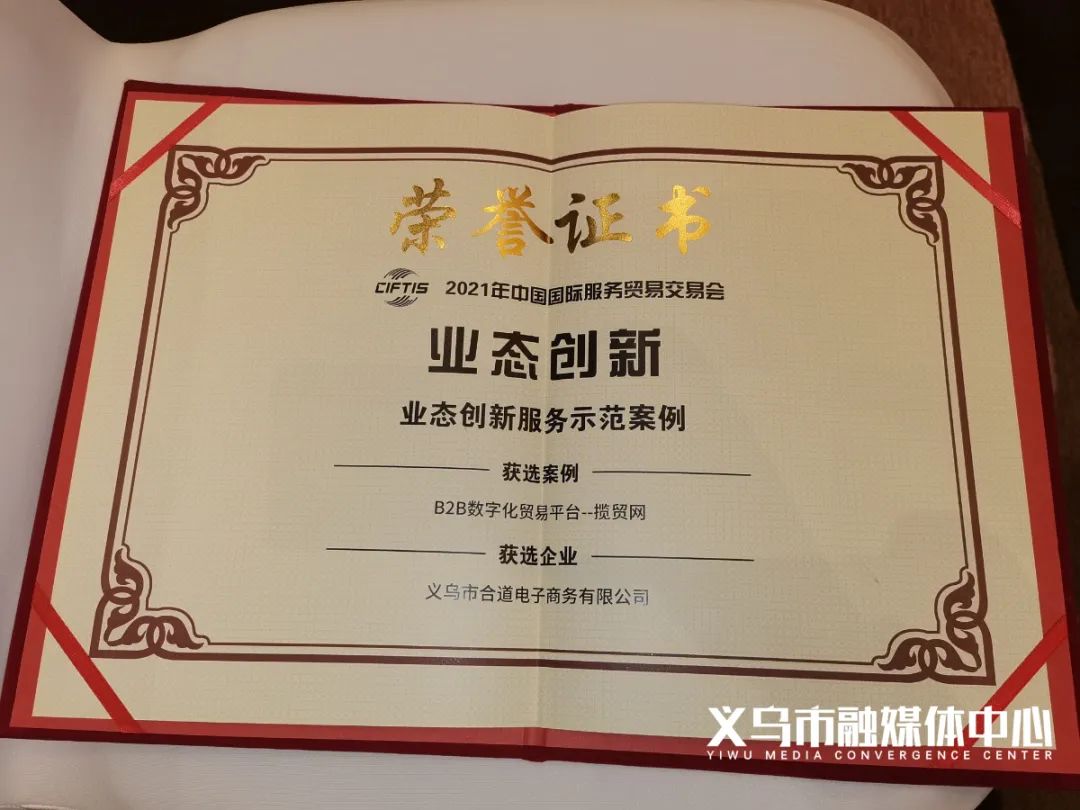 小布从市场发展委获悉,在2021年中国国际服务贸易交易会(简称服贸会)服务示范案例颁奖典礼上,义乌市合道电子商务有限公司的“B2B数字化贸易平台—揽贸网”项目荣获业态创新服务示范案例,义乌数字港科技有限公司“义乌数字监管的数字贸易应用案例”项目荣获中国服务实践案例。