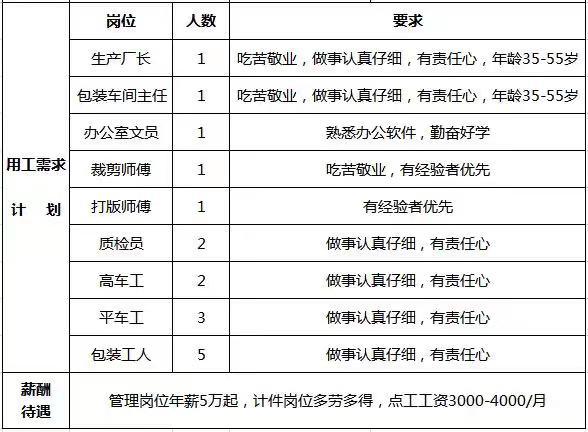 9月20日至明年1月20日在长兴培训及工作(每报名满50人即出发),培训期间每月工资4000元(回庆后按件计酬),工资按月结算,包吃住,包往返车票。男女不限,手脚灵活、能认字即可,年龄18-50周岁。明年春节后即在屏都综合新区泛亚智慧照明公司上班。