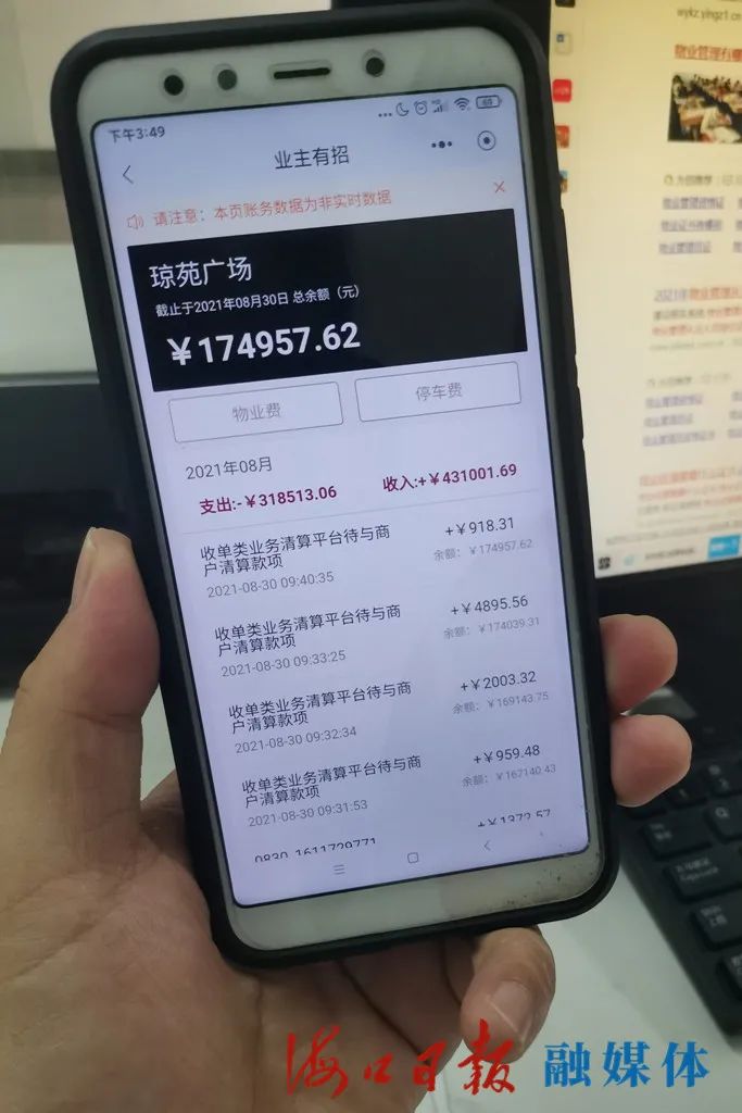 9月3日,在手机上打开“业主有招”APP,琼苑广场小区物业公司经理张曙强仔细浏览其中的内容。数据显示,截至8月30日,小区物业、业委会和银行设立在招商银行的共管账户内有余额17万余元;8月份,该小区支出31万余元,收入43万余元,包括停车场收费收入、电费支出、员工工资发放等名目的费用,每笔支出项和收入项都一一列明。