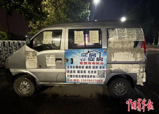 停在鹤岗人民广场正门入口处的面包车,车身贴满卖房的字条。