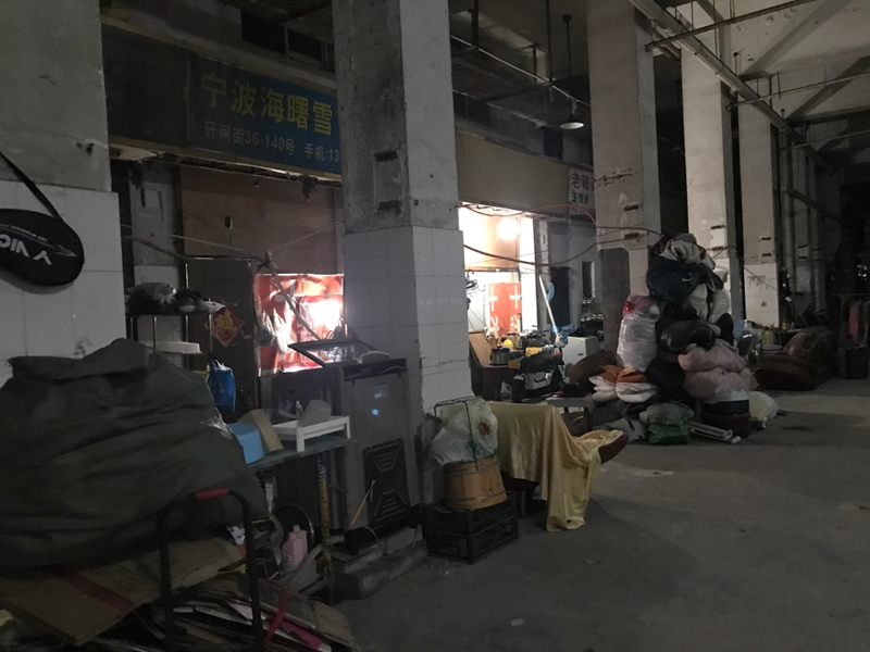 从海曙君子街一个昏暗的出入口,暗访人员进入了原大世界市场。市场内仍有零星店铺存在,商住混合,各种杂物、货物和生活用品随处摆放;地面坑洼不平,破碎水泥块遍地,还有一些脚手架安装其间,部分停放着的车辆积了厚厚的灰尘。