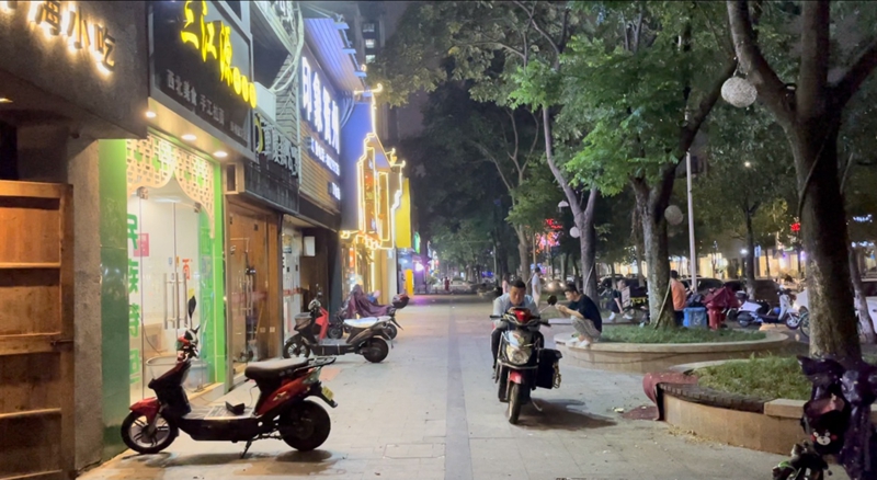 夜色之下,城市中心看似光鲜亮丽,周边环境秩序却显得有些“潦草”和“随意”。看似灯红酒绿的沿街店铺、火树银花的街景,定睛细看,细节之处却有着明显短板。