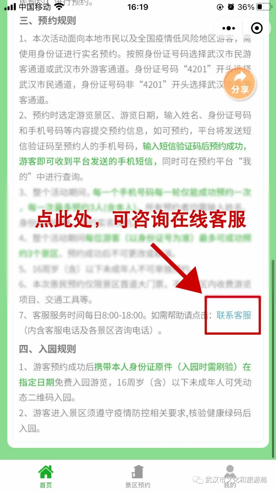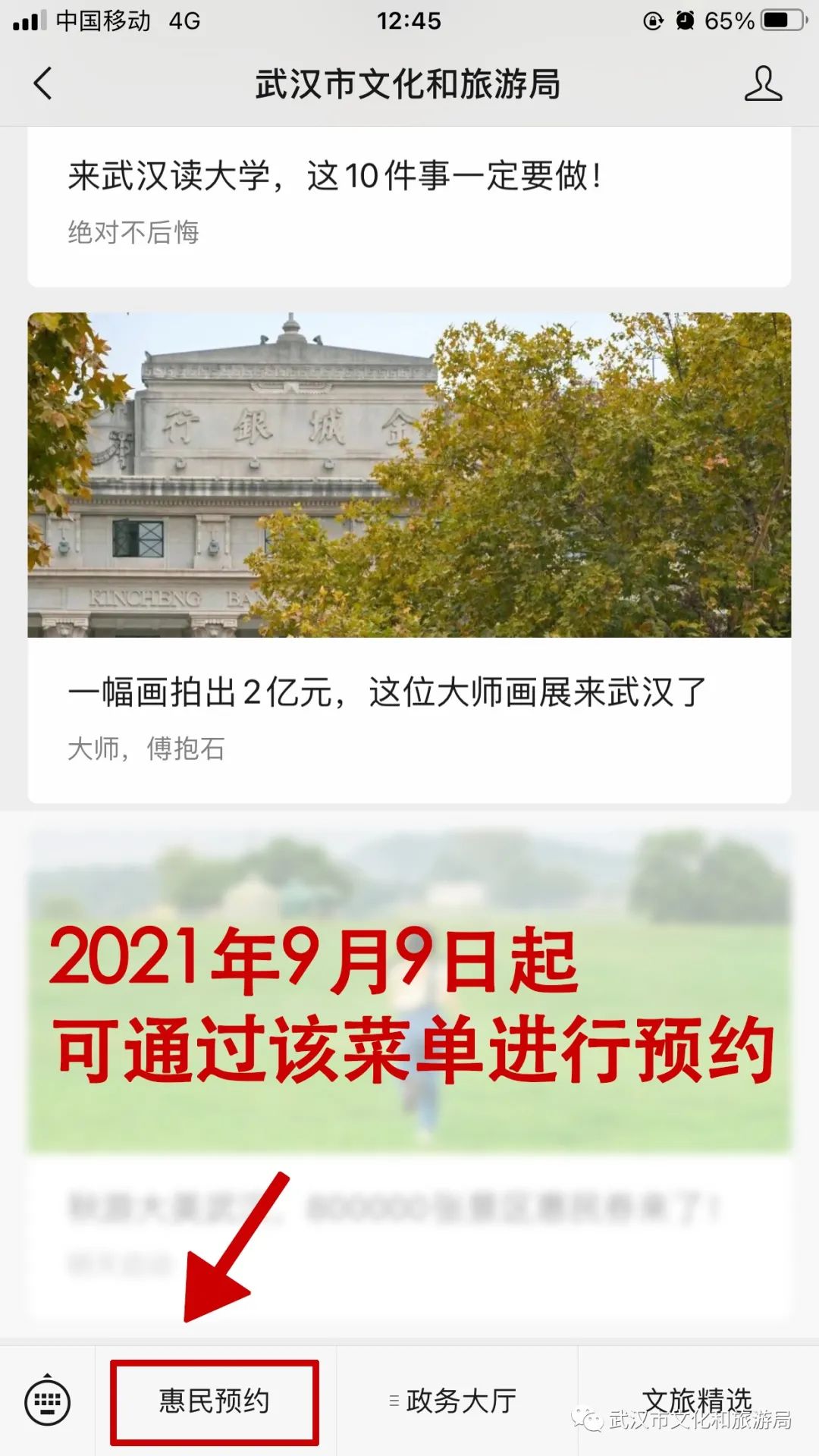 关注本次活动唯一官方平台“武汉市文化和旅游局”官方微信公众号(账号:wuhanwenlv),进入公众号主页,点击左下方菜单栏【惠民预约】进行预约。