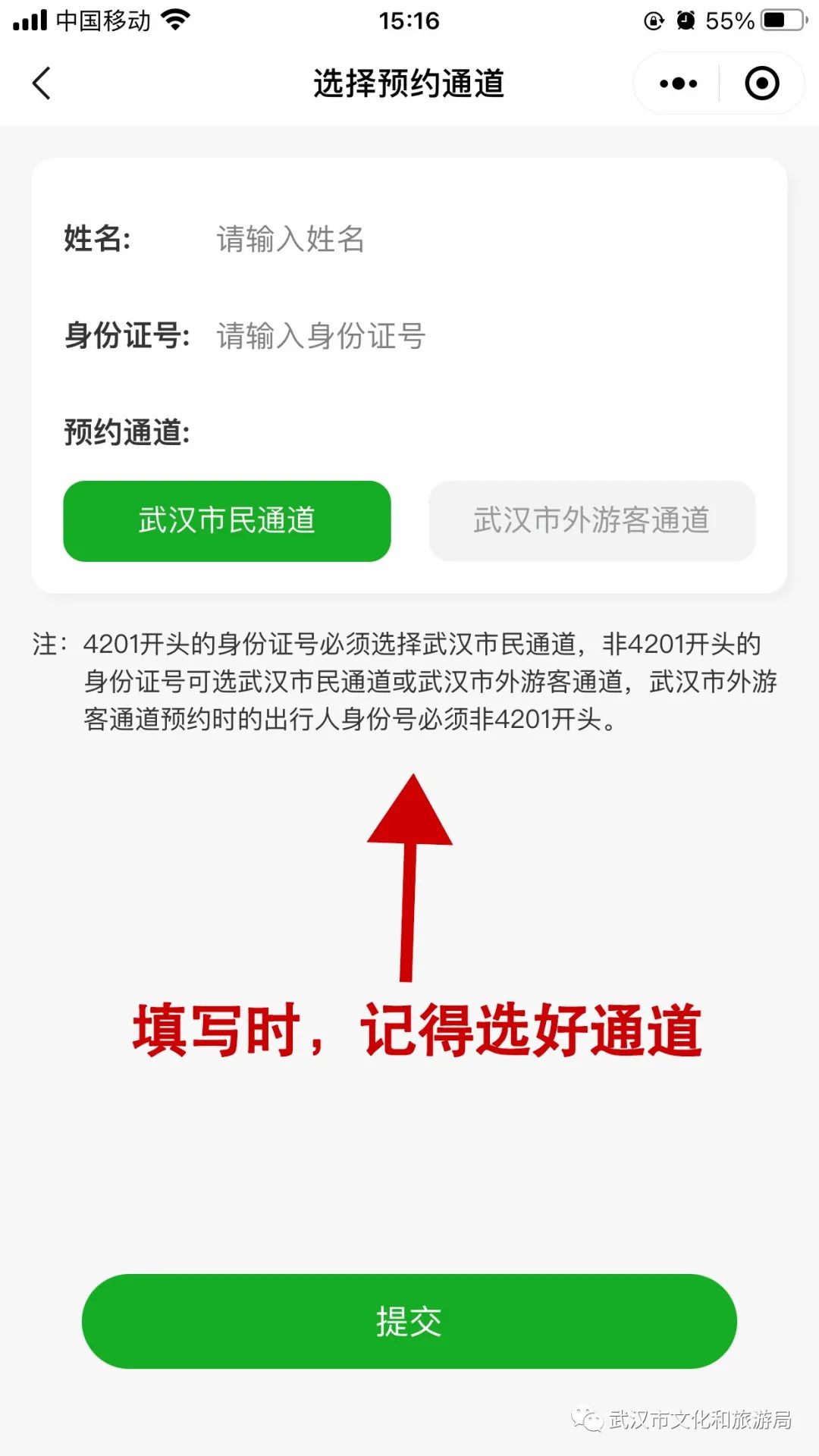 ① 本次活动面向本地市民以及全国疫情低风险地区游客,需使用身份证进行实名预约。按照身份证号码选择武汉市民游客通道或武汉市外游客通道。身份证号码“4201”开头选择武汉市民通道,身份证号码非“4201”开头选择武汉市外游客通道。