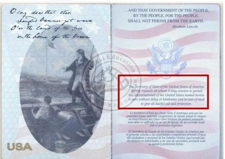谣言吹得美国自己出来辟谣,美国护照后面写的是:美利坚合众国国务卿在此要求相关人士给予该美国公民/国民通行便利及在需要时提供合法的帮助与保护。