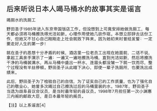 以前总听说日本企业管理层自己擦洗厕所,里面的卫生水平要达到马桶水都可以直接喝的地步……对于卫生要求可谓严苛。其中喝马桶水的毒鸡汤,主角在各种版本中轮着换了好几个,但是最出名的还是野田圣子,曾任日本总务相,她作为职场新人洗厕所的励志故事一直都在网络上流传。但是,还是要问一句是真的吗?马桶真的能刷干净到能喝里面的水吗?
