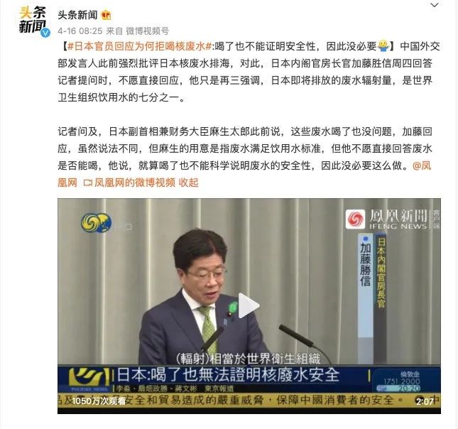 马桶水能不能喝我们没有看到过,但我们知道日本政府此前号称已经处理干净、可以喝的核废水,官员自己不敢喝。