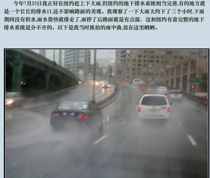 之前坊间传言,“下水道是一个城市的良心,纽约比北京多雨,但下水道好多了。”“纽约是一个路面从来没有积水,下再大的雨也不会内涝的城市。看,一连串的地下排水口,随处可见,还不影响城市美观!看!雨下得很大,地面还是很干爽!”