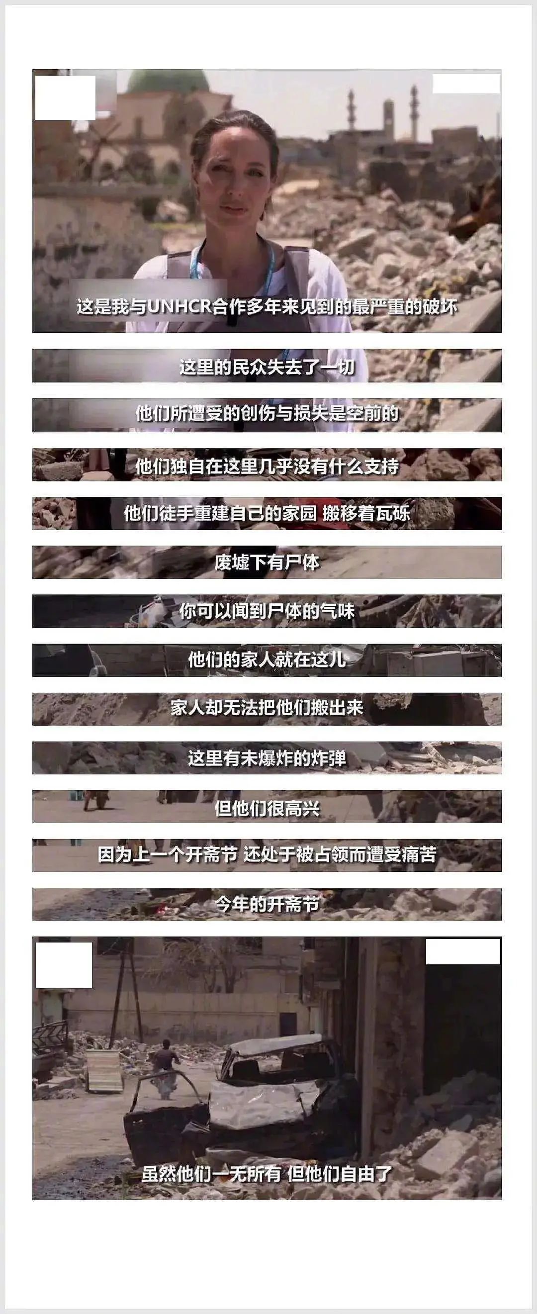 2018年6月16日,联合国难民署特别代表安吉丽娜·朱莉访问了伊拉克摩苏尔城,呼吁国际社会关注当地的重建进程。