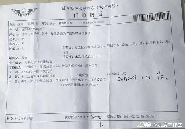 游芳复学的过程可谓一波三折。去年9月份,她在学校突发疾病,随后休学治疗,被医院诊断出抗NMDA受体脑炎、癫痫持续状态、肺部感染等。当年11月份治愈出院。2021年春节后,游先生为女儿申请复学,并出示了医院的门诊病历,上面建议“可返校读书”。学校以门诊病历未加盖医院公章为由,认为其不能作为证明的复学材料。复学未成,今年3月,游先生再次带女儿去广州求医,今年7月,南方医科大学南方医院出具的疾病诊断证明书显示,游芳可以返校上课,但至今她都未成功复学。