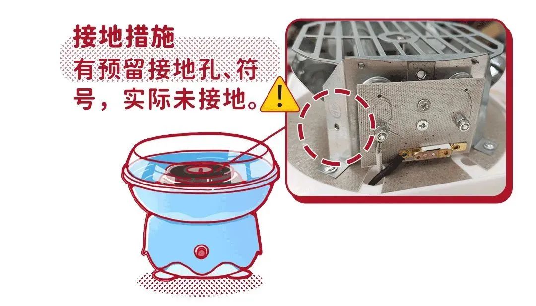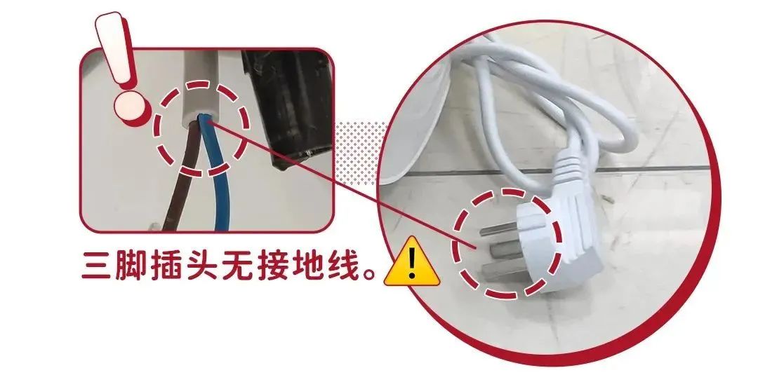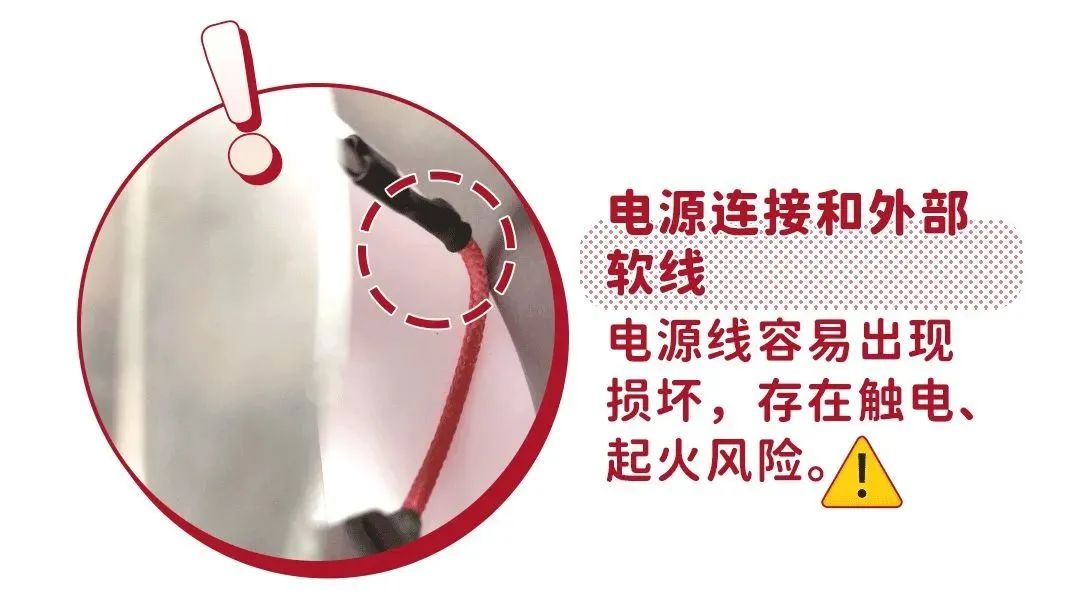 存在电源线无接地线、电源线规格低于标准要求的问题。使用过程中,电源线容易出现损坏,存在触电、起火风险。