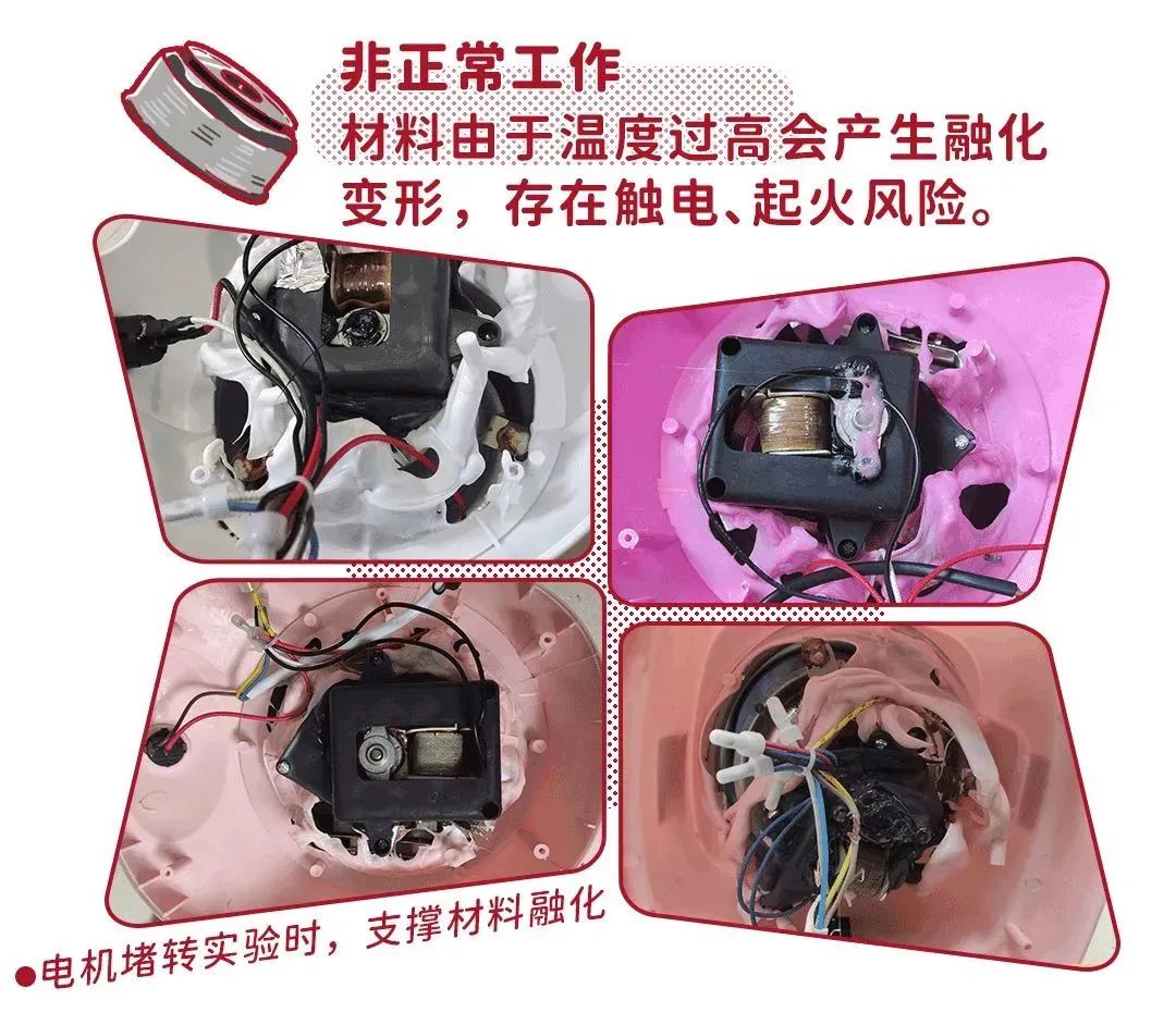 使用中一旦发生故障,无额外保护措施,当电机堵转时,加热元件支撑材料由于温度过高会产生融化变形,存在触电、起火风险。
