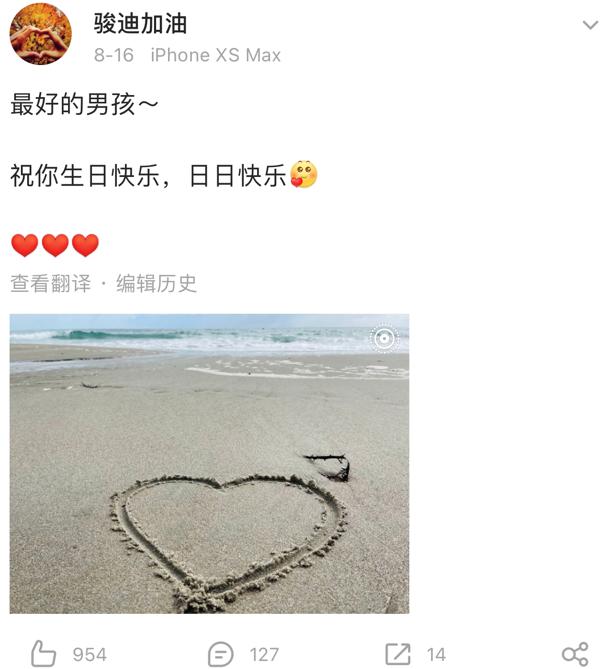 妻子王骏迪也在社交平台上零点发文秀恩爱,为丈夫庆生:最好的男孩,祝你生日快乐,日日快乐。