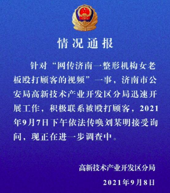 9月8日凌晨,济南公安发布通告称,警方迅速开展工作,积极联系被殴打顾客,7日下午依法传唤刘某明接受询问,现正在进一步调查中。