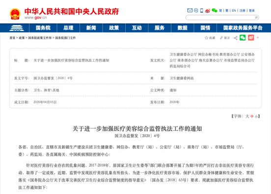 好在国家对于医美行业管控趋严。去年4月,国务院发布《关于进一步加强医疗美容综合监管执法工作的通知》,明确指出“医疗美容服务应当在依法设置医疗美容相关科目的医疗机构内,按照备案的医疗美容服务项目,由主诊医师或者在主诊医师指导下的执业医师负责实施。任何单位和个人,不具备法定条件,不得开展医疗美容服务。”
