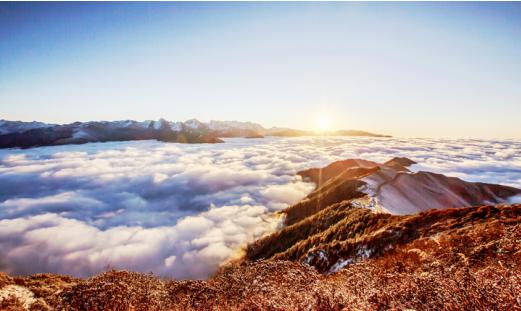 2020年十月初的一个清晨,笔者沿着夹金山山脚向上攀援。晴朗湛蓝的天幕上,金灿灿的太阳洒下金光,把夹金山渲染得格外壮观。还在半山腰,便看到一条白色的云带萦绕在山顶上,似夹金山缠裹的一块头巾。随着距离越来越近,白色的“头巾”逐渐变得清晰,只见白茫茫的云雾在山顶一带蔓延,如棉花般的云彩翻卷着跃跃欲飞,景象煞是好看。