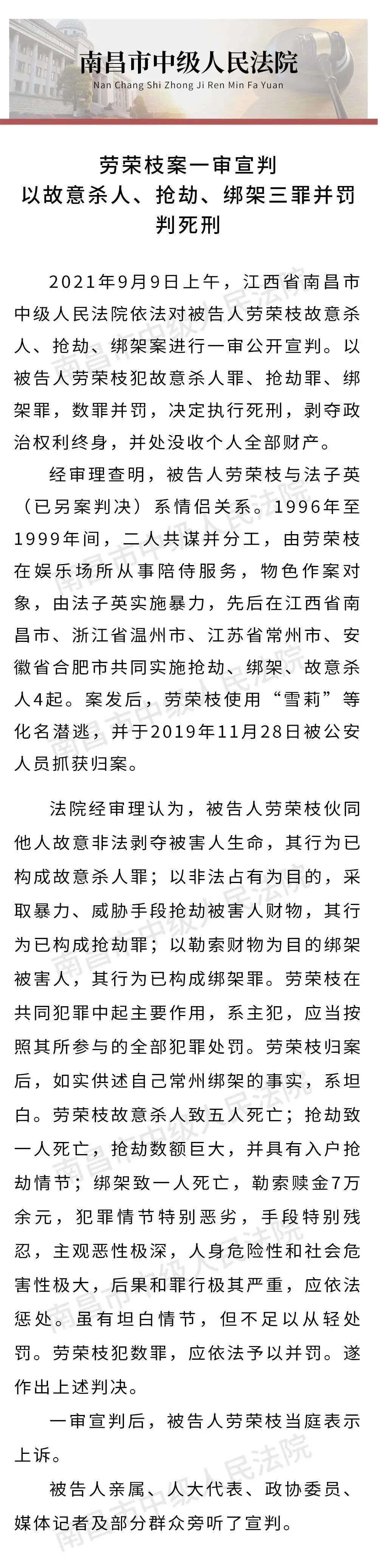 9月9日上午9时,江西南昌中院依法对劳荣枝涉嫌故意杀人、抢劫、绑架罪案进行一审公开宣判。