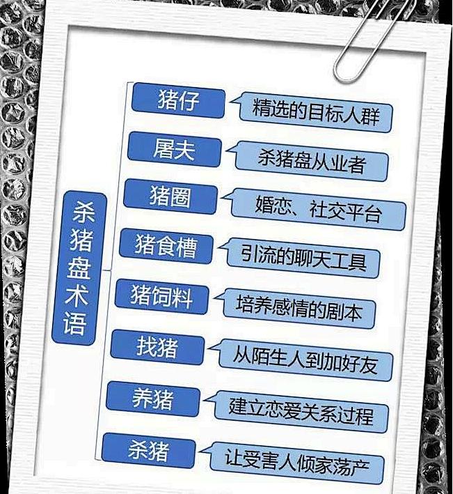 这些诈骗犯,主要在东南亚开设骗局,把感情寂寞的人叫做 “猪”,建立恋爱关系叫 “养猪”。一般都是先通过各种婚恋交友网站或者软件的 “猪圈” 结识 “猪仔”,先和“猪”建立起较为融洽的关系,摸清“猪”的底细,培养感情。然后让这些“猪”在愉快的心情中心甘情愿走向他们的“屠刀”,最后诈骗钱财叫 “杀猪”,被“杀”后还找不到“屠夫”在哪。