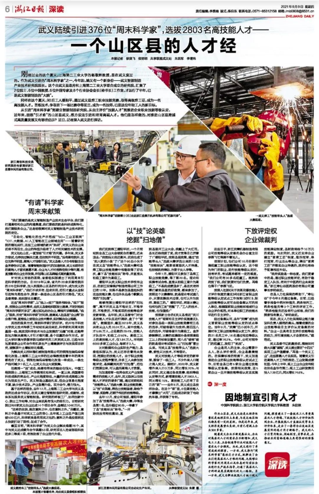 9月9日,《浙江日报》深读版面整版刊发了《武义陆续引进376位“周末科学家”,选拔2803名高技能人才—— 一个山区县的人才经》,报道了武义因地制宜引育人才卓有成效的探索,打造“人才经”,赋能高质量发展,扎实推动共同富裕的建设。