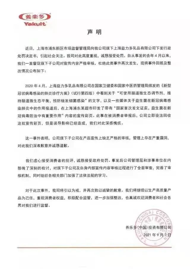 近日,养乐多因宣传“益生菌在新冠病毒防治中有重要作用”等被处以45万元罚款,引起广泛关注。9月7日晚间,养乐多(中国)投资有限公司在官方微博发表声明称,公司对此高度重视,诚恳接受处罚。公司在产品宣传上缺乏严格的审核,管理上存在严重漏洞,对此深表歉意并诚恳道歉。