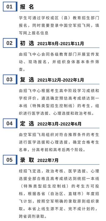 1.选拔程序。根据教育部、公安部、军委政治工作部下达的联合培养计划,空军从招收的理科类高中生飞行学员中遴选确定预选对象,组织到空军航空大学进行军政训练和体验飞行,综合择优录取高考成绩优异、体验飞行合格的学员,于9月上旬入北京大学、清华大学、北京航空航天大学联合培养。