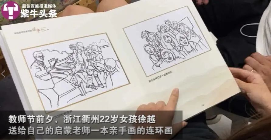 浙江衢州女生徐越,1999年出生,今年6月她从中国美院毕业,入职一家比较知名的公司从事设计工作。8月底,她回到浙江衢州江山老家,给自己的绘画启蒙老师杨日明送去了精心准备的礼物——一本由28张连环画组成的速写画册。徐越说,当天她从杭州坐火车回到江山,一下火车就直奔杨老师所在的艺术培训学校,“想第一时间把画册送给他。”