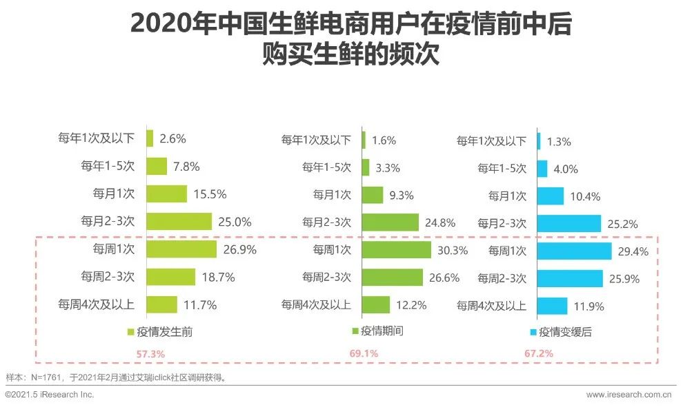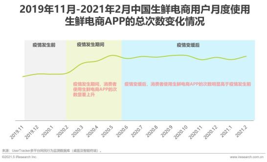 2020年的新冠疫情加速了生鲜的线上渗透,艾瑞监测数据显示,2020年初疫情发生期间,消费者使用生鲜电商APP的次数显著上升,在疫情平缓后,消费者使用生鲜电商APP的次数略有回落,但仍远高于疫情发生前。根据艾瑞调研数据来看,疫情变缓后生鲜电商用户的购买频次显著高于疫情发生前,由此可见,疫情培养了用户使用生鲜电商平台消费的习惯。