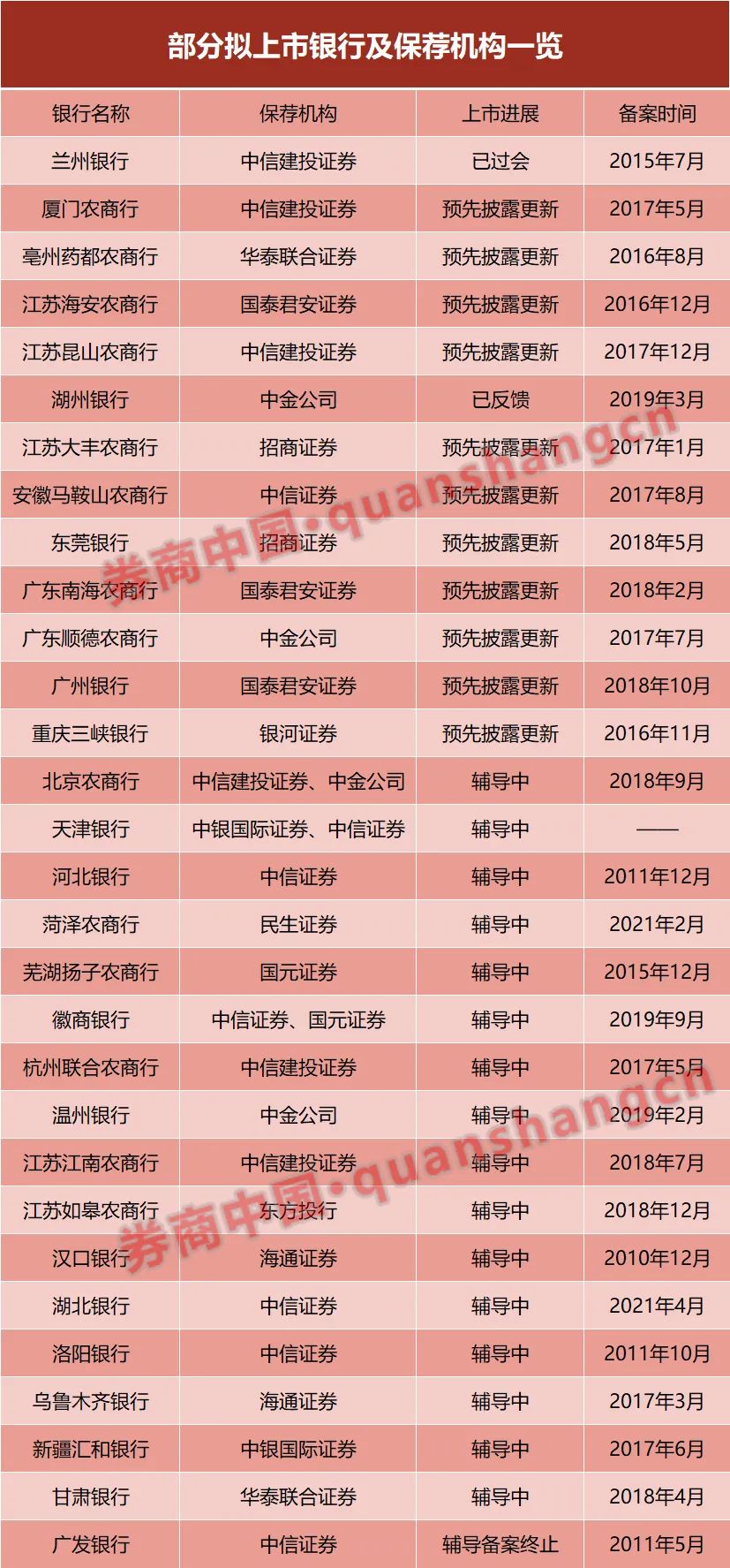其中,处于上市排队状态的包括:接受中金公司辅导的广东顺德农商行、湖州银行,国泰君安辅导的广东南海农商行、广州银行,招商证券辅导的江苏大丰农商行、东莞银行。