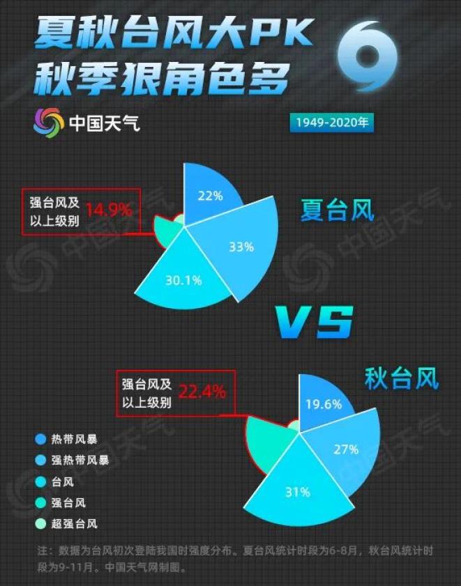 从春分开始,太阳直射点从赤道向北回归线移动,加热了北半球热带海洋,海水热量不断累积,通常8月至9月海温达到最高,海温高有利于台风生成和能量增强。同时,8月底至9月初,冷空气开始活跃,增加了气压梯度,台风中心附近风速加大,也有利于台风强度增强,所以,秋季,强台风或超强台风出现概率更高。