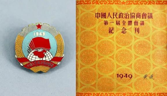 1949年,马来亚归侨黄薇参加中国人民政治协商会议时佩戴的会徽和使用过的《中国人民政治协商会议第一届全体会议纪念刊》