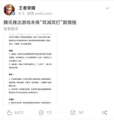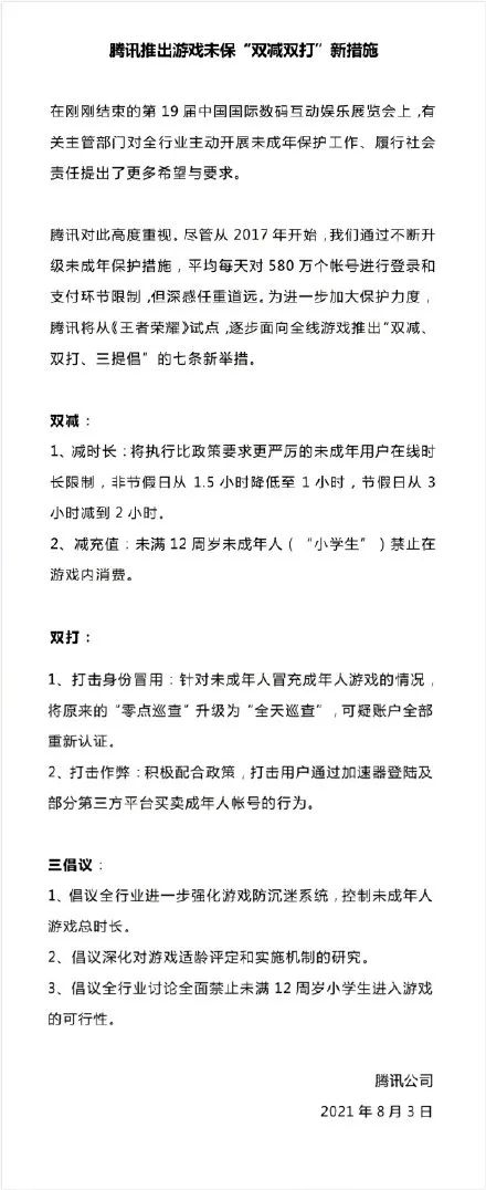此前,@王者荣耀 官方微博曾发布相关消息称,腾讯推出游戏未保“双减双打”新措施。