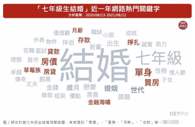 从岛内《KEYPO大数据关键引擎》热门关键词来看,许多台湾网友频频提到“房价”、“房贷”为不结婚的关键,认为高房价让“七年级生”不敢结婚生子;还有不少网友指出“月薪”、“存款”不够,再加上刚出社会就遇上“金融海啸”,还被贴上“草莓族”标签,如此压力让他们宁可单身也不愿步入婚姻。