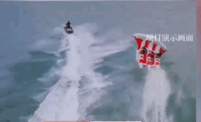 据介绍,“飞鱼”项目是由一人在前面驾驶摩托艇、拖拽后面挂着的橡皮艇,游客则坐在橡皮艇上,速度快时橡皮艇头部会翘起、甚至能接近垂直。